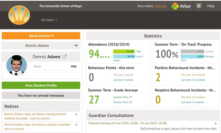 The Statistics section shows information about the student's attendance, behaviour and progress statistics for the current term.